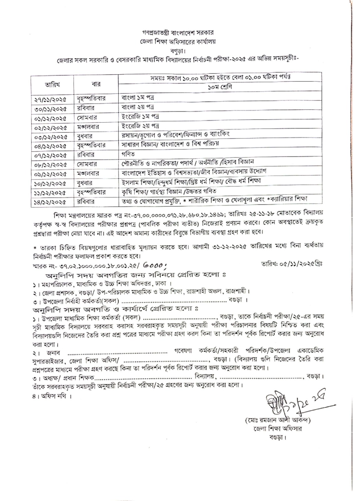 16-Nov-2025 দশম শ্রেণীর নির্বাচনী পরীক্ষা বিজ্ঞপ্তি - ২০২৫